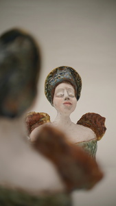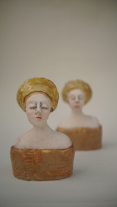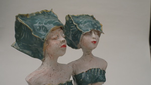2011Twee in keramiek uitgevoerde vrouwen beelden. De eenvoudige vormgeving is onder geschikt bij de rijk gedecoreerde kleding. De zelf ontwikkelde techniek om de klei te bewerken geeft de beelden een eigen gezicht. De geglazuurde details in combinatie met de goudluster hebben een warme uitstraling. Verkocht