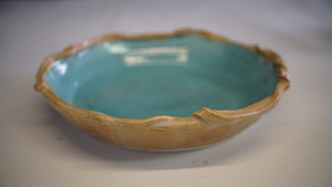 2020Gedraaide schaal. Steengoed. Buitenkant kleur bruin/geelgoud. Binnenkant zeegroen/ seafoam. gebruiks steengoed. Geschikt voor afwasmachine. koffie bekers 17.50per stuk.